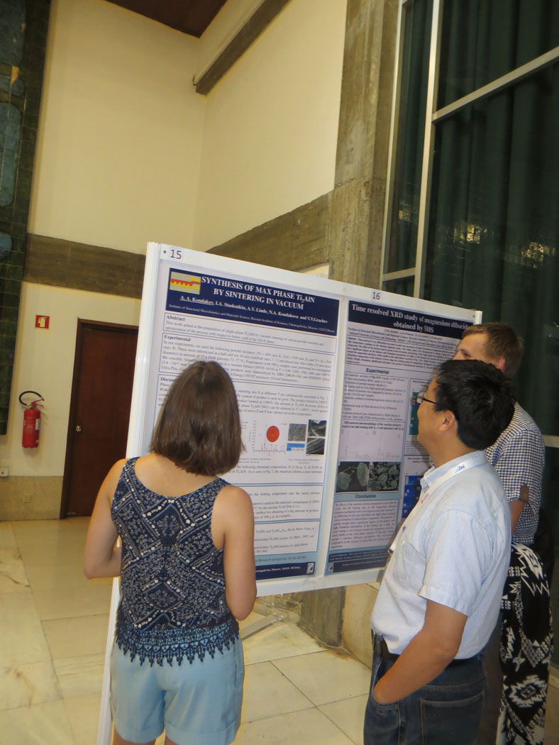 Special section was dedicated to fabrication of composite materials by SHS method. Prof. M. Alymov talked about recent advances of ISMAN in combustion synthesis and shock-assisted processing of materials (M. Alymov. Recent advancements of ISMAN in SHS and explosion/combustion-assisted materials processing). J.T. Li reported on synthesis of multicomponent alloys and thermoelectric materials in centrifugal machines (J. T. Li, Z. C. Yang, and G. G. Liu. Combustion synthesis of high-entropy alloys and thermoelectric materials). V.I. Yukhvid presented a promissory process for fabrication of spherical granules 100–125 µm in diameter for use in additive technologies (V.I. Yukhvid, D.E. Andreev, V.N. Sanin, et al. SHS-produced TiAl cast alloys for additive manufacturing technologies). Circumstantial presentation was made by V.N. Sanin who talked about SHS-production of high-entropy alloys for high-temperature applications (V.N. Sanin, D.M. Ikornikov, D.E. Andreev, et al. Self-propagating high-temperature synthesis of cast high-entropy alloys based on 3d and 4d elements).