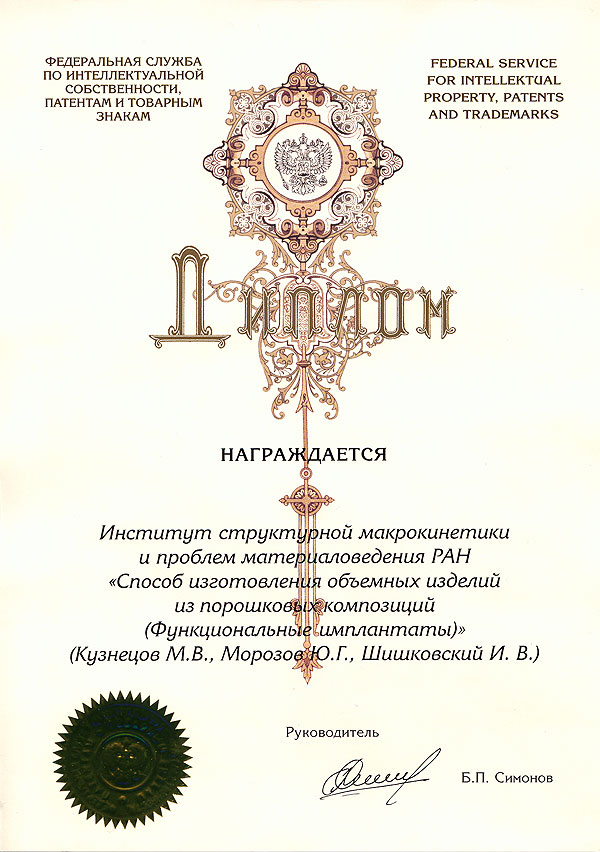 - Диплом Федеральной службы по интеллектуальной собственности, патентам и товарным знакам