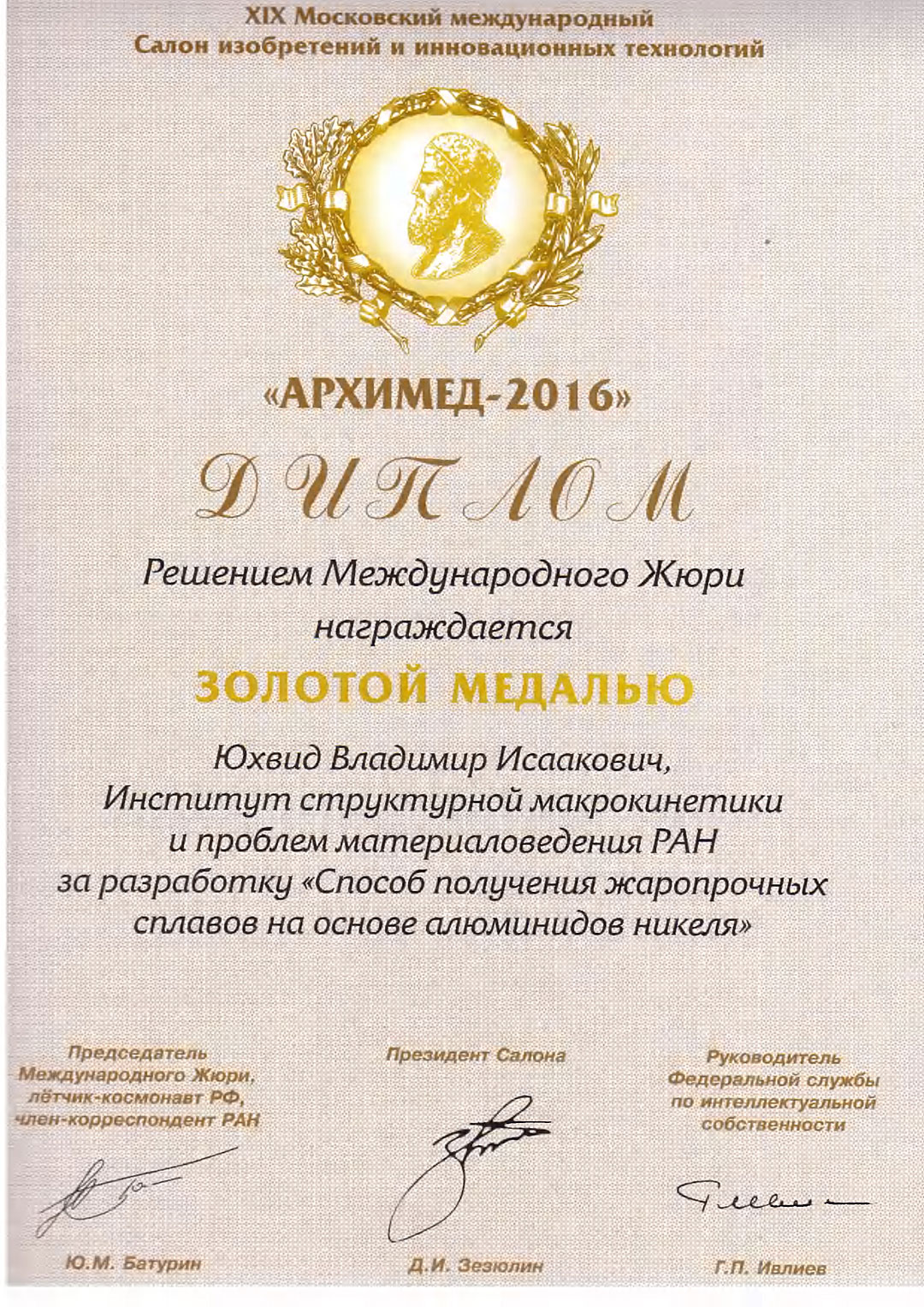 - Юхвид В.И., Санин В.Н., Андреев Д.Е., Икорников Д.М. «Способ получения жаропрочных сплавов»