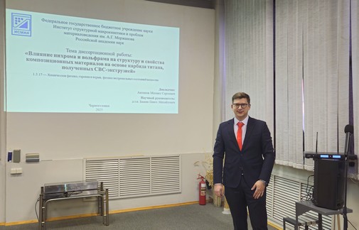 Поздравляем Антипова Михаила с успешной защитой диссертации «Влияние нихрома и вольфрама на структуру и свойства композиционных материалов на основе карбида титана, полученных СВС-экструзией» на соискание ученой степени кандидата технических наук по специальности 1.3.17 – химическая физика, горение и взрыв, физика экстремальных состояний вещества. Желаем дальнейших творческих успехов!